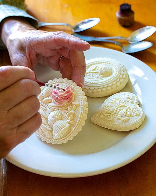 When painting the springerle, always mix your color with an alcohol, such as triple sec. Do not use water as it will soak into the cookie, whereas the alcohol will evaporate quickly and leave the surface dry. We paint them with powdered or very finely ground historical food coloring agents, such as beetroot, spinach, black walnut, turmeric, annatto, cinnamon, and cochineal, by mixing the powder with a small amount of triple sec. Most of these, in addition to powdered blueberry, tomato, pumpkin, and more, can readily be purchased online. You can also use the triple sec with modern gel food colors to paint the cookie.